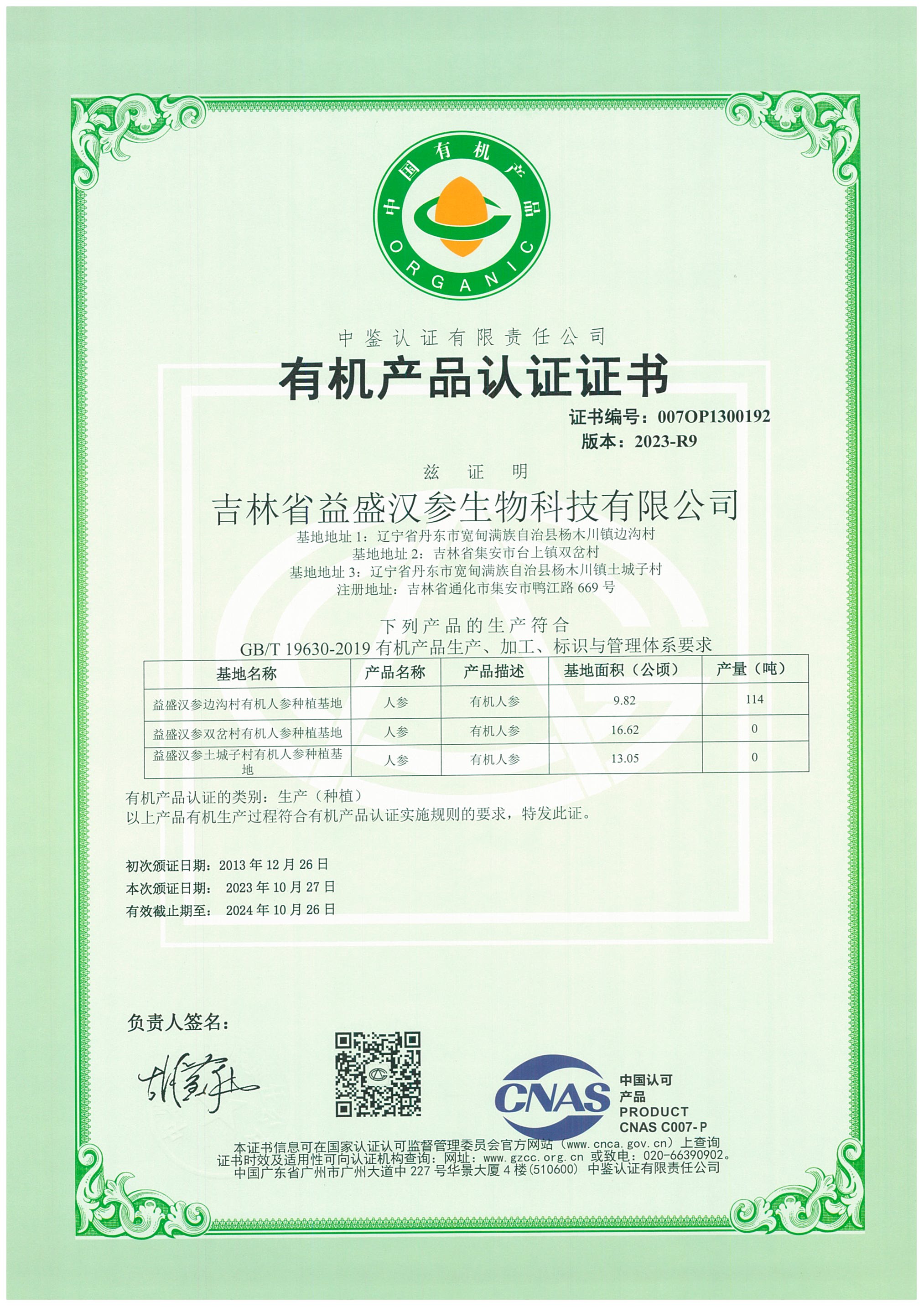 益盛漢參——有機(jī)產(chǎn)品認(rèn)證證書
