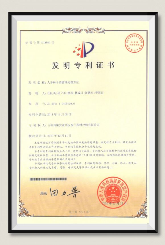 (漢參種子的物理處理方法獲得國(guó)家發(fā)明專(zhuān)利)