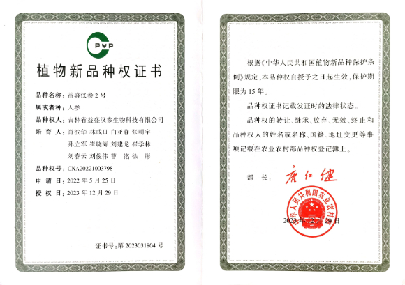 (“益盛漢參2號(hào)”獲得中華人們共和國(guó)農(nóng)業(yè)農(nóng)村部頒發(fā)的植物新品種權(quán)證書(shū))