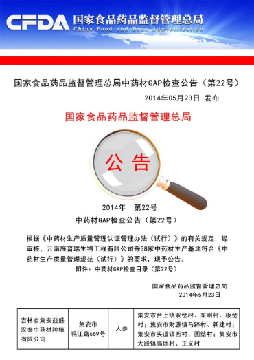 (國家食品藥品監(jiān)督管理總局公示漢參種植基地獲得GAP認證)